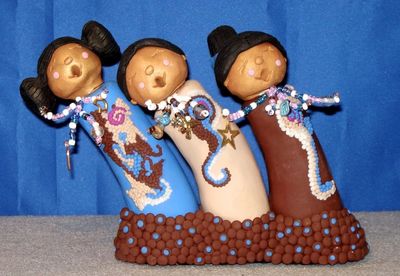 We use brightly colored, low-fire polymer clays, plus mixed media (beads, cloth, feathers, tree branches, ribbons), to create our art. The clay's vibrant colors bring these collectible sculptures to life, with many fo them telling a story.
